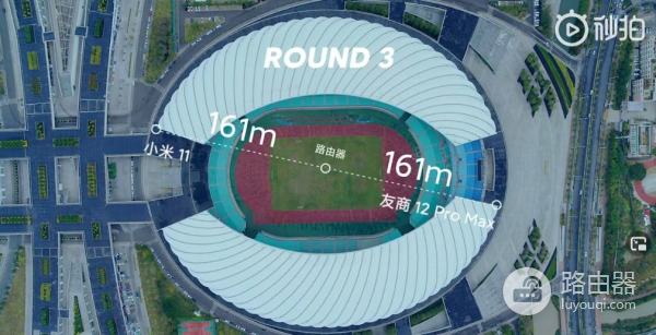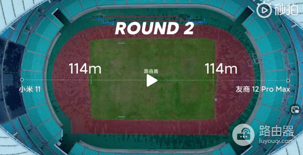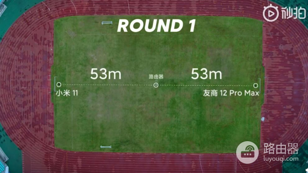 第一轮,将小米路由器ax6000放置体育场中心,小米11以及iPhone 12 Pro Max放置离路由器53米的位置,为了避免互相干扰,两款手机分别放置在南北两侧看台位置。网络接入带宽800Mbps。