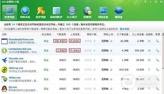用360网络防火墙来查看是否有程序偷偷的占用网络带宽,比如迅雷,如果你没关闭完全的话它就会占用大量的网络资源,如下图。