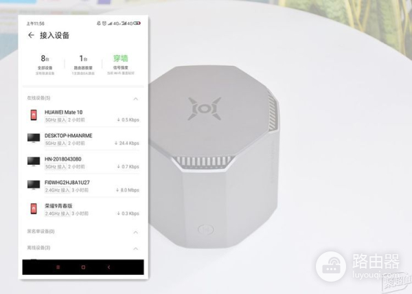 设置且绑定成功后,荣耀猎人游戏路由就会在智慧生活APP主界面显示,点击路由器图标就能进入设备管理界面,更直观的看到路由器的各项配置和连接状态,包括修改设备名称,设备信息,设备解绑。