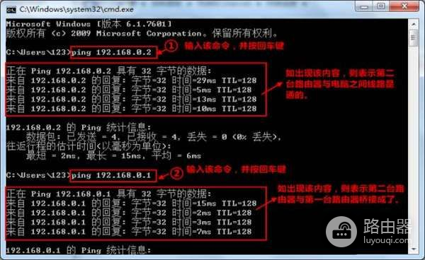 点击第二台电脑桌面左下角的开始—运行—输入CMD, 弹出黑色对话框子之后在光标处输入如下命令,如出现下图所示内容,就证明桥接成功了。