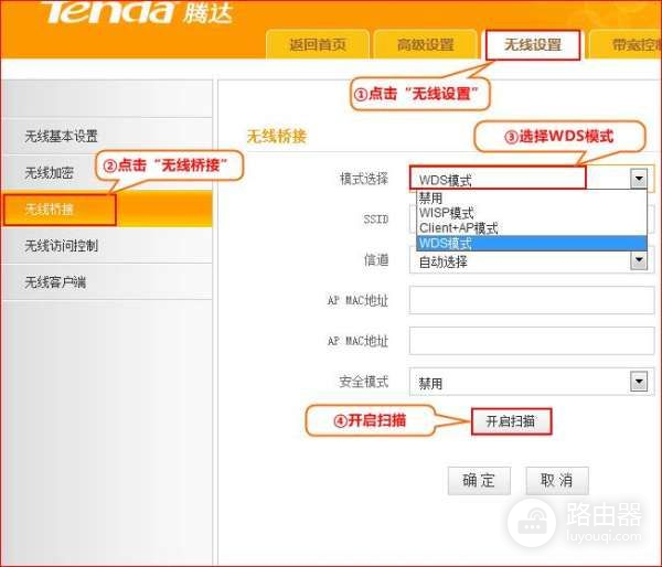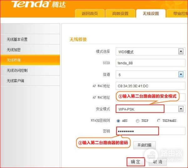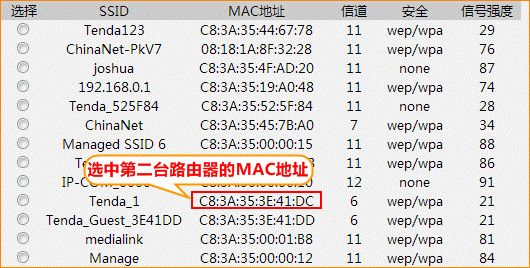 登陆第一台路由器管理界面192.168.0.1,点击“无线设置”—“无线基本设置”选择“无线桥接”,开启扫描到第二台路由器的MAC,如下图所示 :