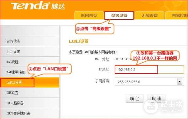 3、点击“高级设置”—“LAN口设置”, 修改路由器的登陆IP为192.168.0.2,设置为不同的网关地址。