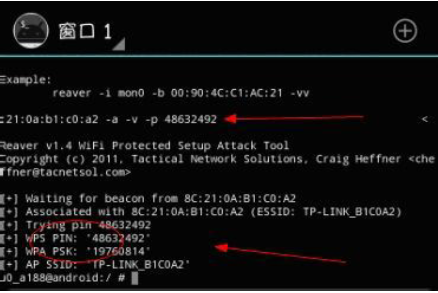 再输入reaver -i wlan0 -b mac -a-v 就可以PIN ,这个mac 你就替换成路由器的mac
