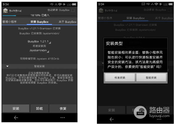 进去BusyBox以后请等待上面的进度条加载到100%即可点击安装,就会出现标准安装和智能安装首先点击标准安装,安装完四个包之后重启手机!