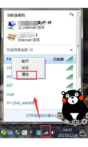1、点击电脑右下角的无线网络图标,在点键点击已连接的无线网络,选择“属性”进行查看。