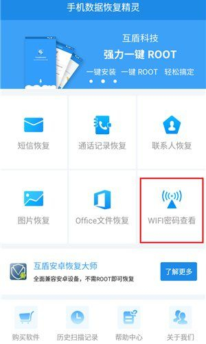 1、在手机上下载手机数据恢复精灵APP,这个软件中有一个“WiFi密码查看”功能,我们可以用它来查看WiFi密码。不过在此之前,手机必须先进行root操作。