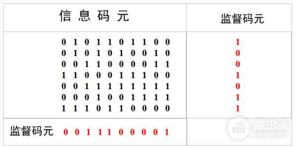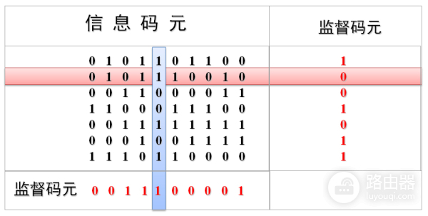 请看上图的红色监督码元,它们与信息码元有什么规律?如果您仔细观察,就会发现由于红色码元的出现,使得每一行和每一列的"1"的个数都是偶数。