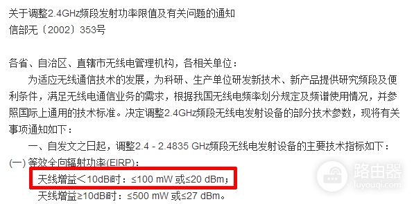于是工信部对路由器等设备的辐射功率值作出了明确限定,因为路由器基本是全向辐射的,天线增益比较小,所以适用于第一种情况,即辐射功率不得超过100毫瓦。