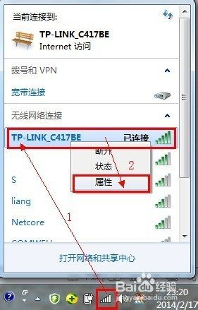 左键单击电脑任务栏右下方的无线图标,选中无线网络位置,鼠标右键单击,选择属性。