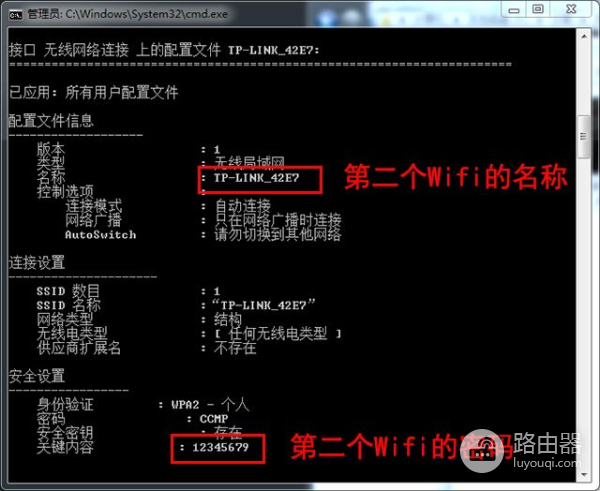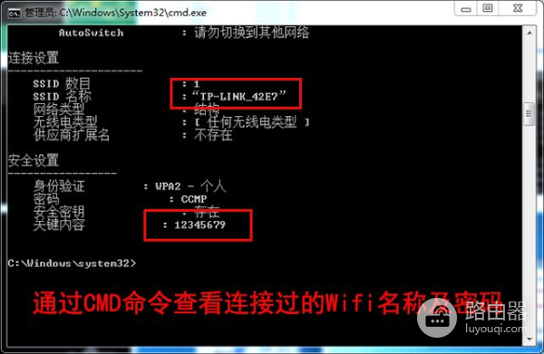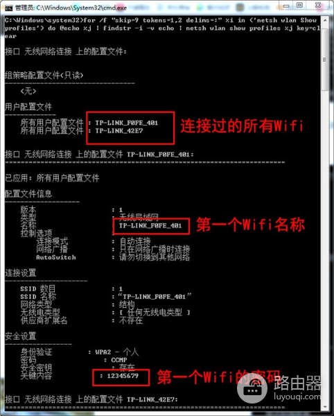 第三步,输入完成后按下回车键,就可以看到本机所连接过的所有无线网络的信息了,在安全设置中的关键内容就是无线网络密码。