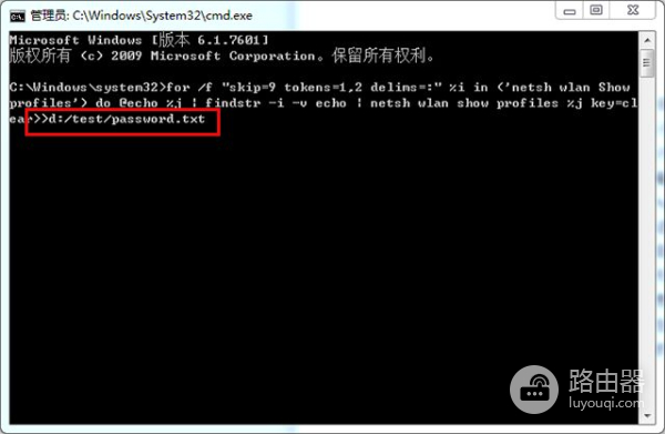 第四步,如果我们想把所有相关信息保存起来,可以把它们输出到文本中留着以后查看。我们在命令提示符中添加输出命令,在上面那第命令的后面加上>>d:/password.txt按回车后就可以把结果保存到了我们指定的文件中了。
