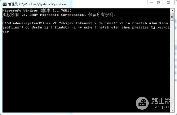 第二步,在命令提示符中输入这条命令:for /f"skip=9 tokens=1,2 delims=:" %i in ('netsh WLAN Show profiles') do@echo %j | findstr -i -v echo | netsh wlan show profiles %j key=clear注意空格,如果复制粘贴不行的话就手动输入,注意要用英文输入法,字符为半角。
