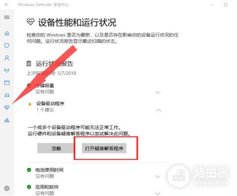 5.win10wifi功能怎么恢复打开Windows Defender安全中心,点击红色箭头指示的图标进入“设备性能和运行状况”,点击“设备驱动程序”中的“打开疑难解答程序”