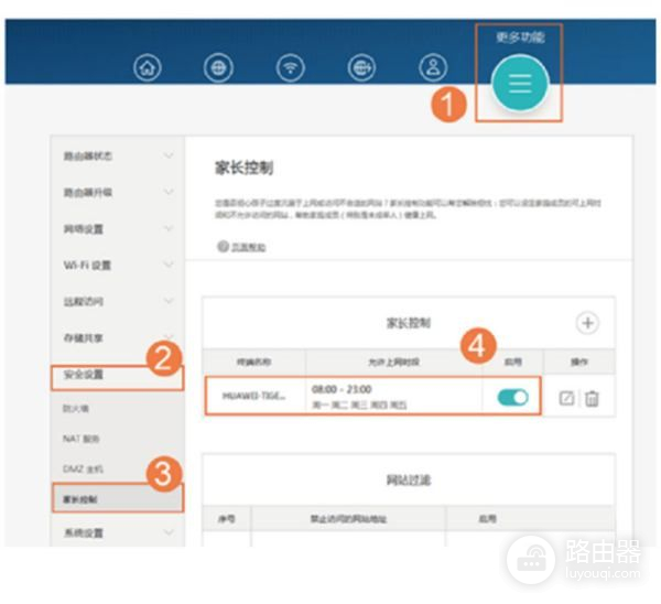 3、进入“更多功能 > 安全设置 > 家长控制”页面。检查不能上网的那台电脑是否在“家长控制”的终端列表里。如果是,请关闭或删除家长控制规则后,重新尝试是否可以上网。