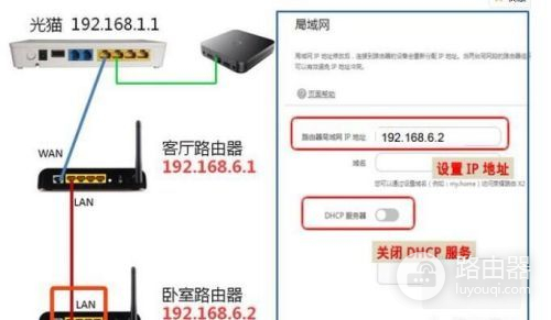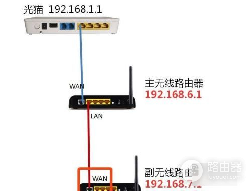 连接方式:副路由器的WAN端口连接主路由器的LAN端口,副路由器WAN端口从主路由器自动获取IP地址;配置方式:主路由器、副路由器、光猫不能使用同一个网段,参考下图设置,否则容易出现IP地址冲突,网络不稳定或者无法使用网络等情况。