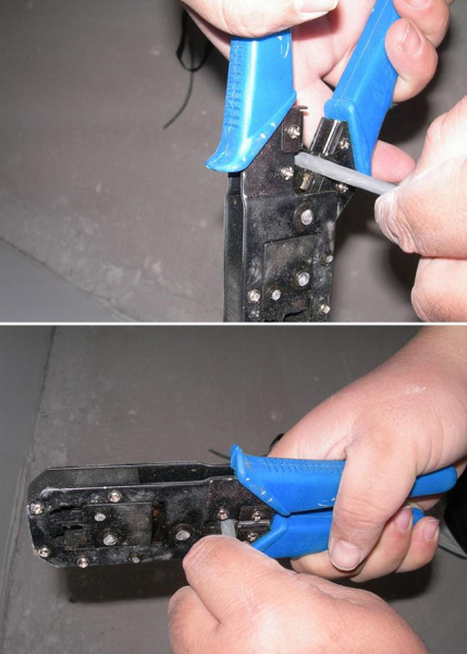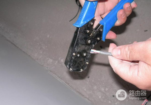 第六步:如果说网线已全部进入水晶头的底部,那么就可以将它放在网线钳的压口中,并稍微用力将其压实。不过需要注意的是,部分网线皮也要进入水晶头,这样网线才会更牢固。