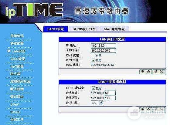 接着将LAN端口的ip地址设置成与主路由器的LAN不一样的网段,例如主路由器的ⅰp是192.168.0.1,那么副路由器就设192.168.1.1.
