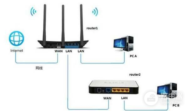 两台路由器的连接方法: 设置完副路由器之后就可以连接两台路由器了,准备一根网线,一端连接是主路由器的LAN端口,另一端连接是副路由器的Wan端口,这样就完成了两台路由器的串联。