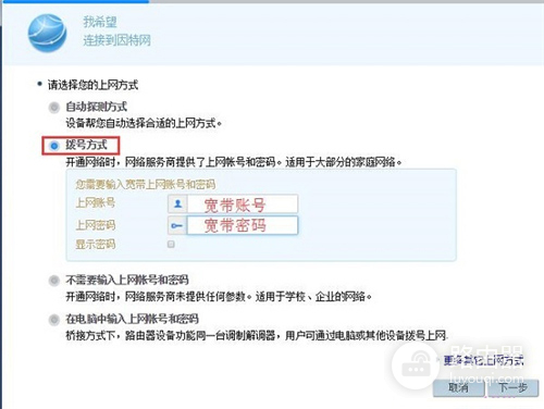 ④在电脑中输入上网账号和密码:这种方式几乎用不到,所以可以忽略此选项。