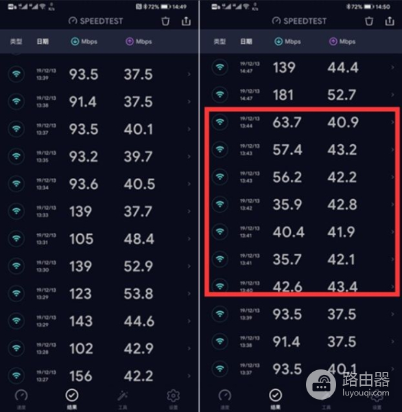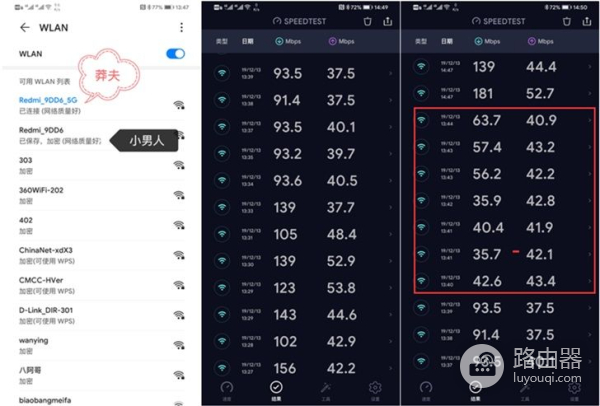 在选择5GHz WiFi之后,本想着现在室内各地点挨个测试网速,但是第一轮的网速测试就令沧海有点懵,我使用的100M的联通宽带,第一次测试完之后数据显示,下载156Mbps。上传42.2Mbps。