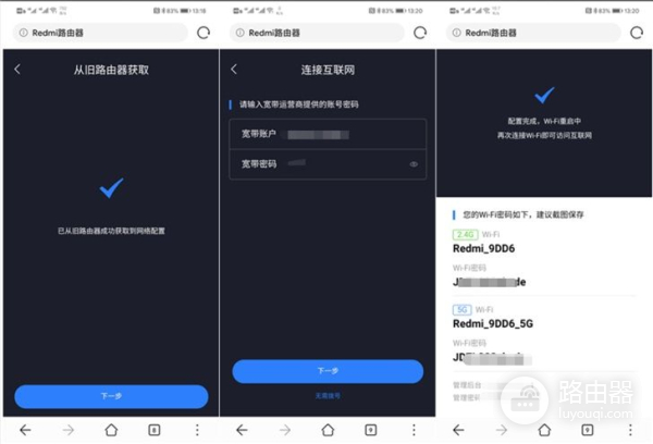 现在市面上,几乎所有路由器安装方式都一样,要么连接好路由器之后输入宽带账号密码即可,要么从旧路由器将宽带账密一键导入。在这里沧海使用的是一键导入,具体操作也很简单,连接好Redmi路由器AC2100之后,先不要将旧路由器断电,将主网线(入户的那根网线)插在Redmi路由器AC2100的WAN口上(路由器背后靠近电源指示灯的那个网口),再将随机附带的网线分别插入旧路由器的WAN口及Redmi路由器AC2100的LAN口,接下来的事就跟Redmi路由器AC2100无关了,之后全程手机操作即可。