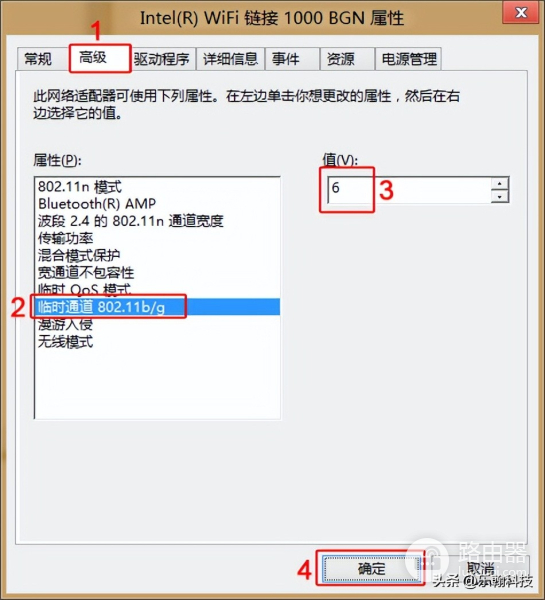 7.5 在弹出的无线网卡属性设置对话框,点击“高级”选项卡下的“临时通道 802.11b/g”,然后将值更改为“6”后点击“确定”按钮。如下图所示: