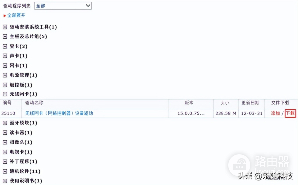 8.4 然后展开“无线网卡”,根据实际情况选择并点击如下图所示的“下载”链接。如下图所示: