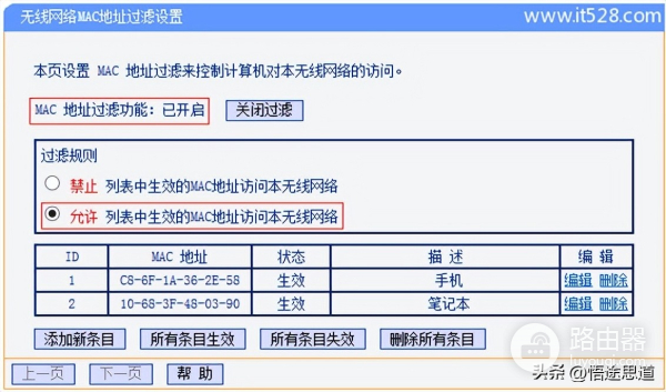 “无线MAC地址过滤”功能,可以用来限制哪些无线设备可以连接wifi上网的,与手机来电的“白名单”、“黑名单”功能类似。设置方法如下:
