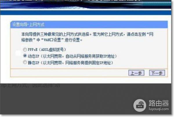 4、如何点击下一步,进入上网方式设置,可以看到有三种上网方式的选择,如果你家是拨号的话那么就用PPPoE。动态IP一般电脑直接插上网络就可以用的,上层有DHCP服务器的。